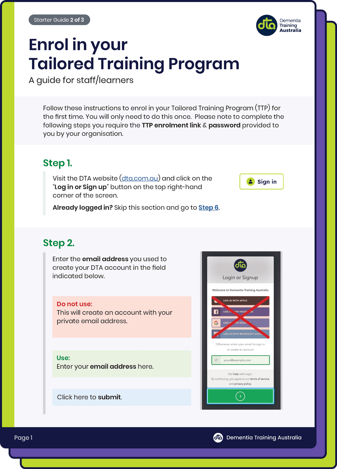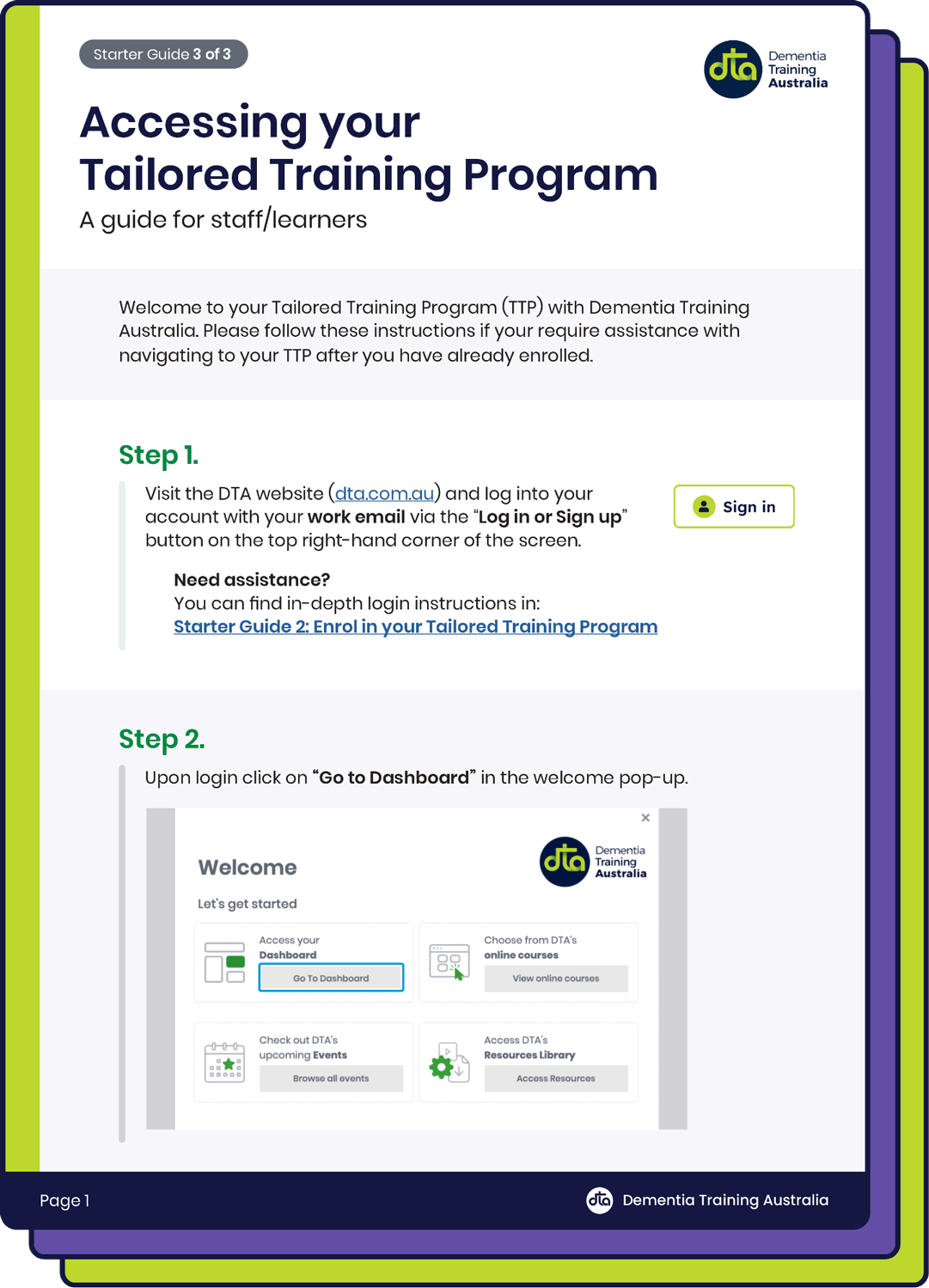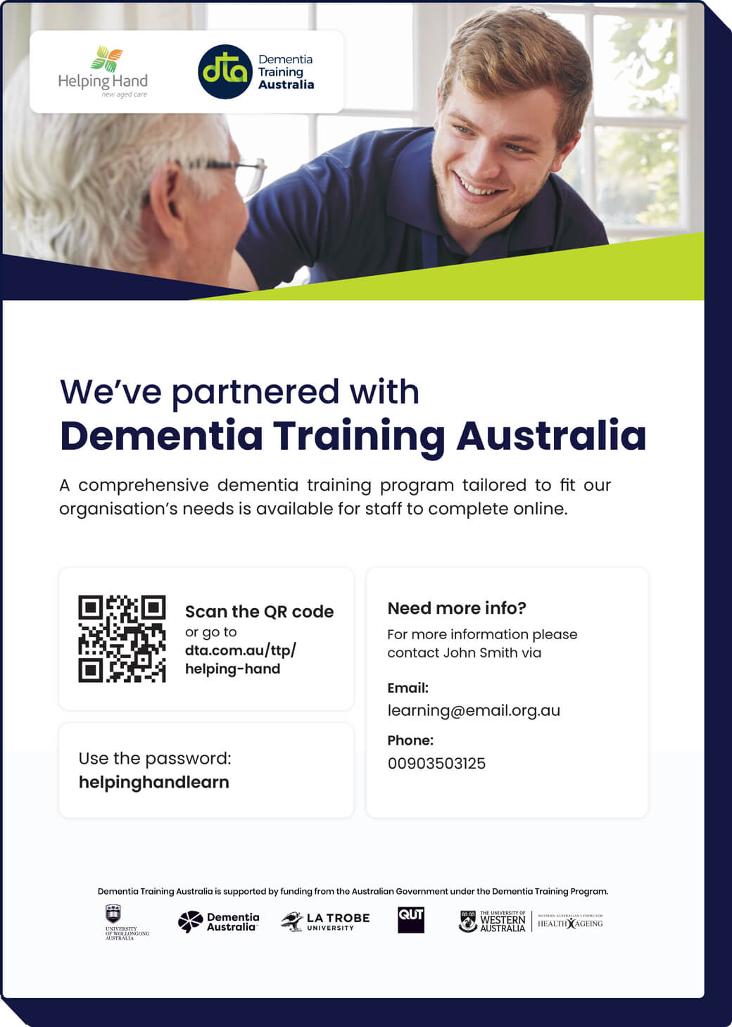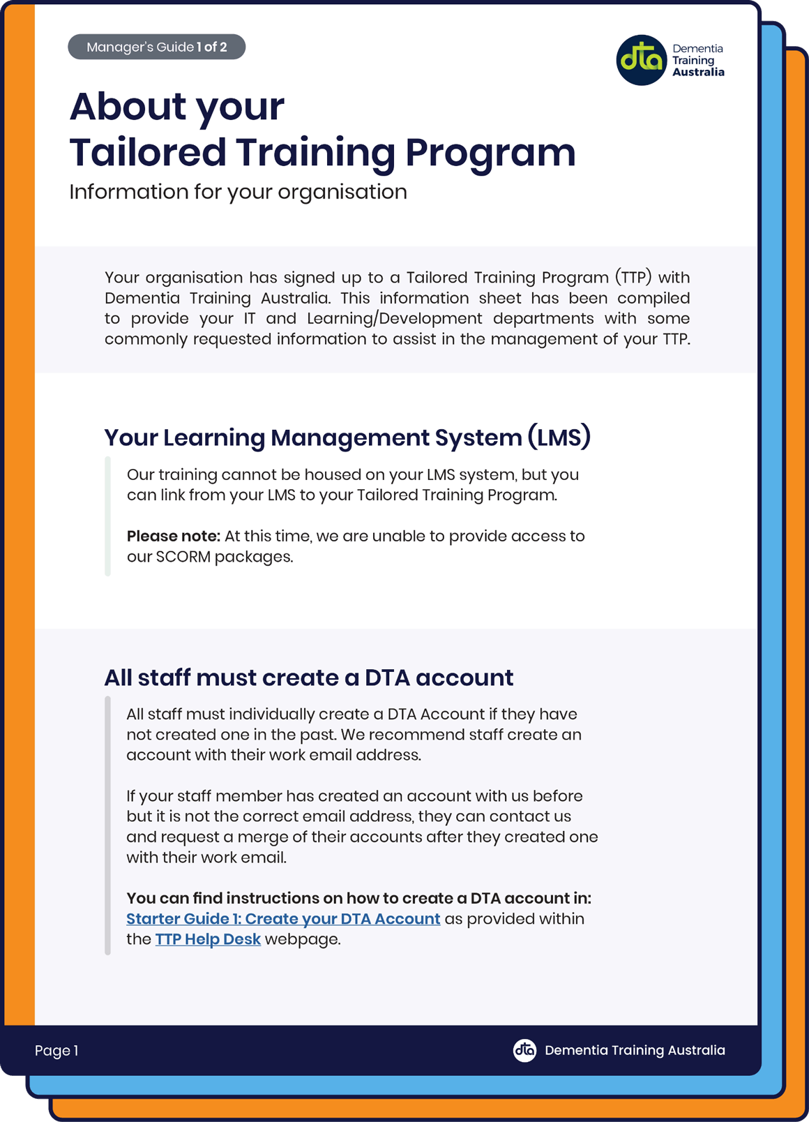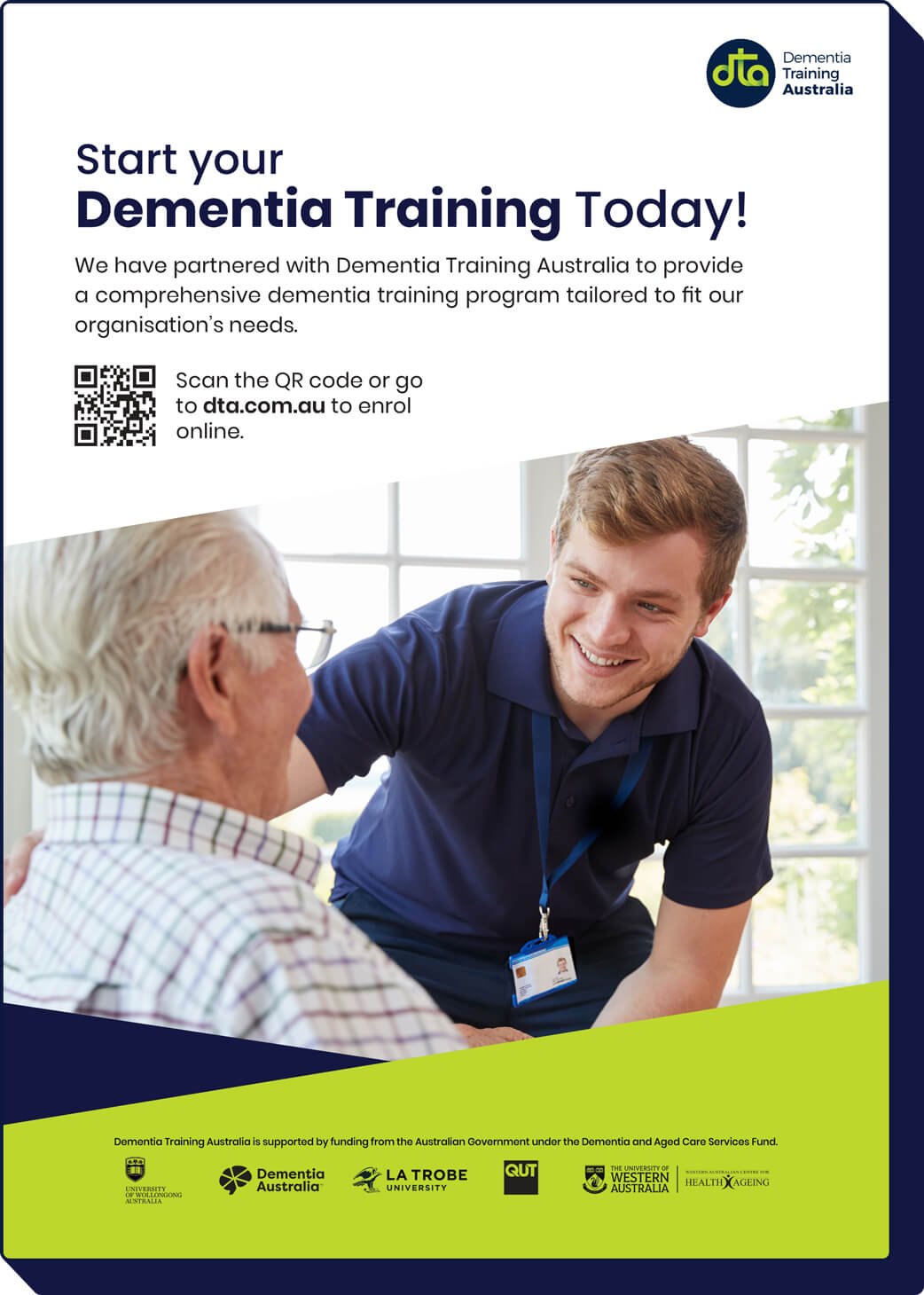 Dementia Training Australia (DTA) is a government-funded consortium providing dementia care education. As part of its services, DTA offers Tailored Training Programs (TTPs), collaborating with organisations to develop and deliver customised training programs designed specifically for their workforce.