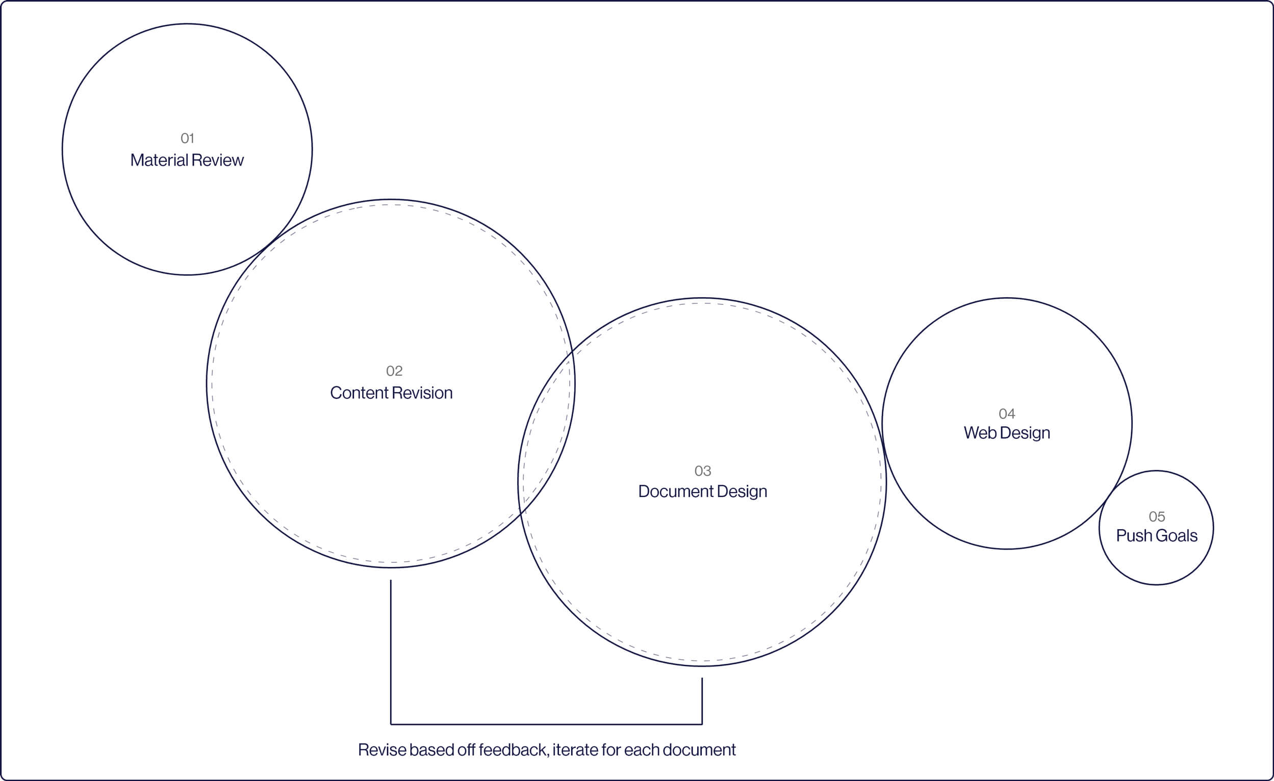 Flowchart illustrating our five-step process: Material Review, Content Revision, Document Design, Web Design, and Push Goals, with iterative revisions based on feedback.